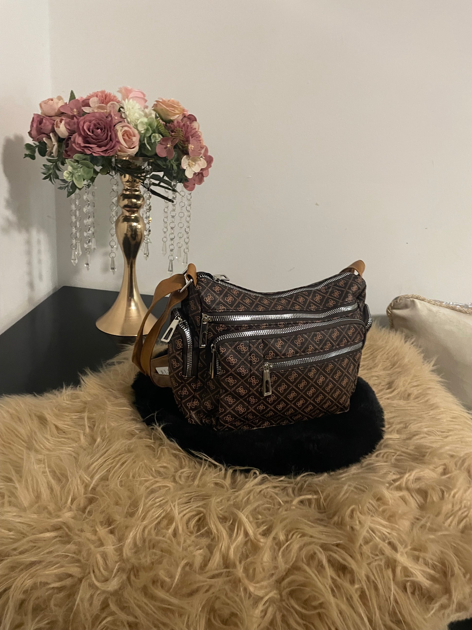 Voeg een vleugje elegantie toe aan je look met deze stijlvolle dameshandtas. De tas heeft een tijdloze bruin-zwarte monogramprint met verfijnde details en zilverkleurige ritsen. Dankzij de ruime vakken en stevige verstelbare schouderriem combineert deze tas mode en functionaliteit op perfecte wijze.